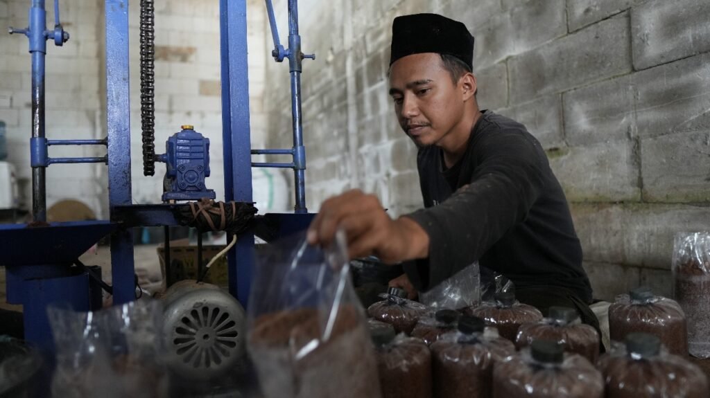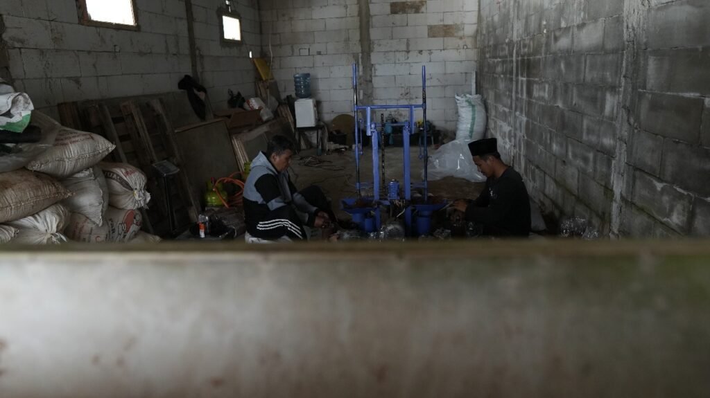 Ketika kami tiba di Desa Cikawari pada Sabtu, 18 Oktober 2025, Ustaz Sopwan Ismail sedang masyuk memadatkan serbuk kayu ke dalam plastik bening untuk membuat baglog (media tanam bibit jamur tiram). Dengan bantuan mesin pemadat, pembuatan baglog ini terasa ringan dan memangkas waktu. Sejak pagi sampai kami datang pada siang hari ia sudah membuat sekitar 50 buah baglog seberat 1,5 kilogram per satu buahnya.