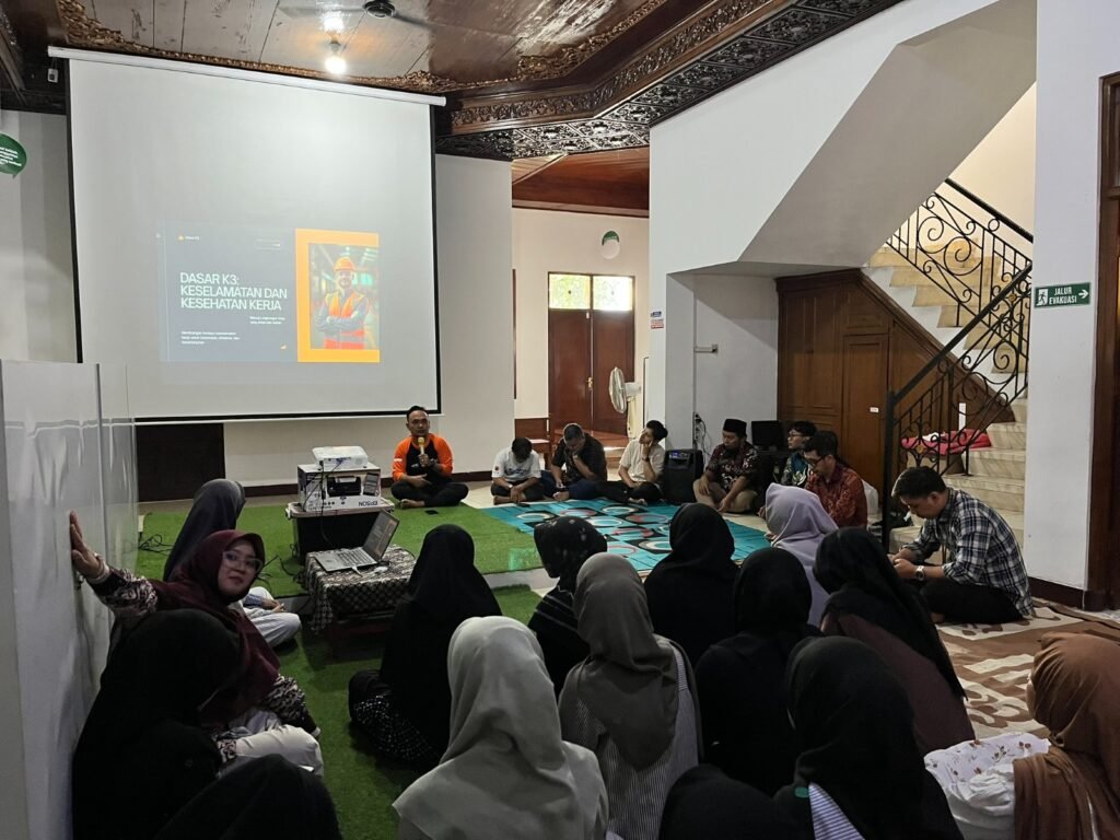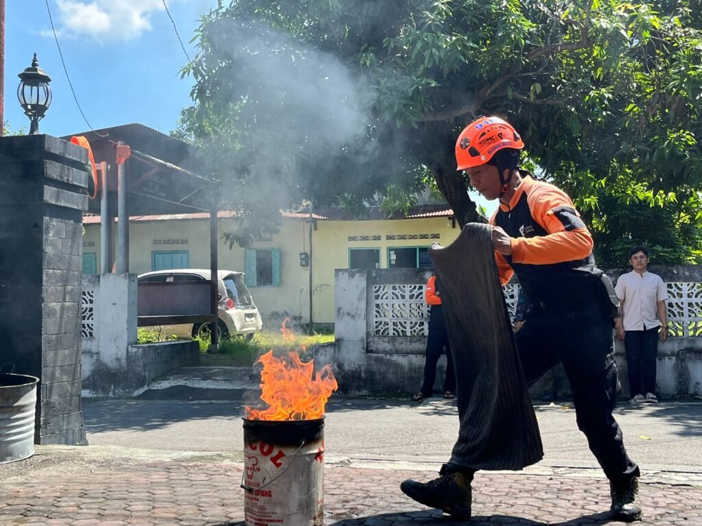 Dalam sesi simulasi evakuasi mandiri, peserta dilatih untuk merespons situasi darurat gempa bumi, kebakaran, dan banjir secara cepat dan terorganisir.